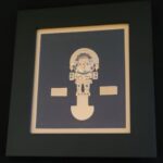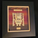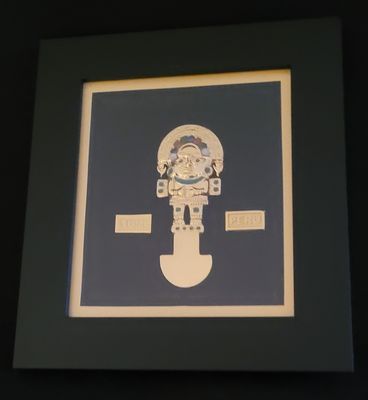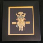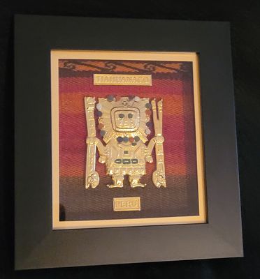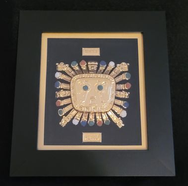Petit tableau en bois avec figurine dorée représentant des symboles pré inca ou Inca. Ces figurines sont baignées en or 18K et posées sur un tissu noir ou une « manta cuzco ». Une vitre protège la figurine dorée : Tumi, Mama killa, Inti, etc.
